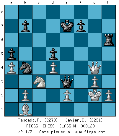 Last move : 1/2-1/2 2024 April 12 5:1:27 [Event "FICGS__CHESS__CLASS_M__000129"] [Site "FICGS"] [Date "2023.10.16"] [Round "1"] [White "Taboada,Pedro Pablo"] [Black "Javier,Christian"] [Result "1/2-1/2"] [WhiteElo "2270"] [BlackElo "2231"] 1.d4 Nf6 2.Nf3 e6 3.c4 d5 4.g3 Bb4+ 5.Bd2 Be7 6.Bg2 O-O 7.O-O c6 8.Qc2 Nbd7 9.a4 a5 10.Na3 Bd6 11.Ne1 Re8 12.Nd3 e5 13.cxd5 e4 14.Nc5 cxd5 15.Nb5 Nb8 16.Bg5 Nc6 17.f3 exf3 18.Bxf3 Be7 19.Rac1 Nb4 20.Qd2 Na2 21.Ra1 Nb4 22.Bg2 Bd7 23.Nxd7 Qxd7 24.Rac1 Rac8 25.Rxc8 Rxc8 26.Nc3 h6 27.Bxf6 Bxf6 28.Rxf6 gxf6 29.Qxh6 Rc6 30.Bh3 f5 31.Qh5 Qe7 32.Bxf5 Qe3+ 33.Kg2 Rh6 34.Qg4+ Kf8 35.Bb1 Re6 36.Qh4 Rh6 37.Qg4 Ke7 1/2-1/2 Follow this game move after move (download)A big shock; the best chess player in history has passed away. (Lajos Portisch, about Bobby Fischer's death) Karpov ist ein Museumsstück. (Garry Kasparov) EL Ajedrez es como la vida. (Boris Spassky) J'ai toujours senti une vague pitié pour l'homme qui ne connaît rien aux échecs, tout comme j'en aurais pour un homme ignorant de l'amour. Les Echecs, comme la musique ou comme l'amour, ont le pouvoir de rendre heureux. (Siegbert Tarrasch) As a goal marker shodan is important. As a destination it is a poor place to stop. (Thomas Tamayo)