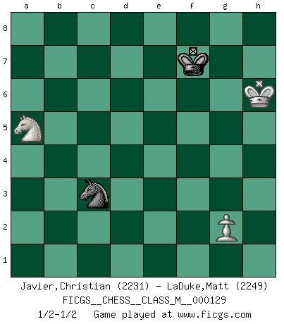 Last move : 1/2-1/2 2024 February 20 11:53:17 [Event "FICGS__CHESS__CLASS_M__000129"] [Site "FICGS"] [Date "2023.10.16"] [Round "1"] [White "Javier,Christian"] [Black "LaDuke,Matt"] [Result "1/2-1/2"] [WhiteElo "2231"] [BlackElo "2249"] 1.e4 e5 2.Nf3 Nc6 3.Bc4 Bc5 4.c3 Nf6 5.d3 d6 6.O-O a6 7.a4 O-O 8.Nbd2 h6 9.Re1 a5 10.Nf1 Be6 11.Bxe6 fxe6 12.Be3 Bxe3 13.Rxe3 Rf7 14.Qb3 Qd7 15.Ng3 Raf8 16.h3 d5 17.Re2 Qd6 18.Rd1 Nh7 19.exd5 exd5 20.d4 exd4 21.Nxd4 Nxd4 22.Rxd4 c6 23.Qc2 Ng5 24.Rg4 Re7 25.h4 Nh7 26.c4 Rxe2 27.Qxe2 Kh8 28.cxd5 Qxd5 29.Re4 Nf6 30.Re5 Qd4 31.Re7 Ng4 32.Re8 Rxe8 33.Qxe8+ Kh7 34.Qe4+ Qxe4 35.Nxe4 Ne5 36.h5 g6 37.Nd6 b6 38.Kh2 gxh5 39.b3 Kg6 40.Kg3 Nd3 41.Kh4 Nxf2 42.Nc8 b5 43.Ne7+ Kf7 44.Nxc6 bxa4 45.bxa4 Nd1 46.Kxh5 Nb2 47.Kxh6 Nxa4 48.Nxa5 Nc3 1/2-1/2 Follow this game move after move (download)When you don't know what to play, wait for an idea to come into your opponent's mind. You may be sure that idea will be wrong. (Siegbert Tarrasch) Das Schachspiel ist ein See, in welchem eine Mücke baden und ein Elefant ertrinken kann. (Emanuel Lasker) El jugador blanco perdió porque fallo en recordar la coreccta continuación y tuvo que pensar por sí mismo las movidas. (Siegbert Tarrasch) À la honte des hommes, on sait que les lois du jeu sont les seules qui soient partout justes, claires, inviolables et exécutées. Pourquoi l'Indien qui a donné les règles du jeu d'échecs est-il obéi de bon gré dans toute la terre, et que les décrétales des papes, par exemple, sont aujourd'hui un objet d'horreur et de mépris ? C'est que l'inventeur des échecs combina tout avec justesse pour la satisfaction des joueurs, et que les papes, dans leurs décrétales, n'eurent en vue que leur seul avantage. L'Indien voulut exercer également l'esprit des hommes et leur donner du plaisir; les papes ont voulu abrutir l'esprit des hommes. Voltaire (Dictionnaire philosophique / Garnier 1967) The age of a woman doesn't mean a thing. The best tunes are played on the oldest fiddles. (Ralph Waldo Emerson)