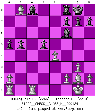 Last move : 1-0 2024 February 4 5:39:46 [Event "FICGS__CHESS__CLASS_M__000129"] [Site "FICGS"] [Date "2023.10.16"] [Round "1"] [White "Duttagupta,Aniruddha"] [Black "Taboada,Pedro Pablo"] [Result "1-0"] [WhiteElo "2266"] [BlackElo "2270"] 1.c4 Nf6 2.Nc3 c5 3.Nf3 Nc6 4.g3 d5 5.d4 e6 6.cxd5 Nxd5 7.Bg2 cxd4 8.Nxd4 Nxc3 9.bxc3 Nxd4 10.Qxd4 Qxd4 11.cxd4 Bd6 12.O-O Rb8 13.e4 b6 14.Bb2 O-O 15.Rfc1 a5 16.Rc6 Be7 17.Rc7 Bd8 18.R7c1 b5 19.d5 exd5 20.Be5 Bf6 21.Bxb8 1-0 Follow this game move after move (download)Every Chess master was once a beginner. (Chernev) Früher wurde jeder komplizierte Zug, jedes interessante Opfer mit großem Beifall und Enthusiasmus aufgenommen. Heute schaltet man einfach seinen Fritz an, und man kann sehen, was los ist, ob der Zug geht oder nicht. (Vladimir Kramnik) Uno por uno, yo los acribillé, mi superioridad muy pronto se volvio aparente. (Jose Capablanca) Mais n'est-ce pas déjà le limiter injurieusement que d'appeler les échecs un jeu? N'est-ce pas aussi une science, un art, ou quelque chose qui, comme le cercueil de Mahomet entre ciel et terre, est suspendu entre l'un et l'autre, et qui réunit un nombre incroyable de contraires ? (Stefan Zweig) To err is human, but to really foul things up requires a computer. (Farmer's Almanac, 1978)