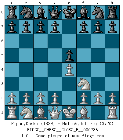 Last move : 1-0 2023 November 28 3:29:38 [Event "FICGS__CHESS__CLASS_F__000236"] [Site "FICGS"] [Date "2023.10.17"] [Round "1"] [White "Pipac,Darko"] [Black "Malish,Dmitriy"] [Result "1-0"] [WhiteElo "1329"] [BlackElo "0770"] 1.e4 e5 2.Nf3 1-0 This chess game has been lost on time (started : 2023.10.17 12:35:0) Follow this game move after move (download)Bobby is the finest Chess player this country ever produced. His memory for the moves, his brilliance in dreaming up combinations, and his fierce determination to win are uncanny. (John Collins) Die westlichen Werte sind eine Sprache, welche die Putin-Administration nicht versteht. (Garry Kasparov) En el Ajedrez, tal como en la vida, las bendiciones de hoy pueden ser el veneno del mañana. (Assaic) Les erreurs sont comme les malheurs, elles n'arrivent jamais seules. (Siegbert Tarrasch) Hello Thibault, if I have had a plan (and I had one, I hope), I have forgotten it during the last week... - Hello Heinz-Georg. What do you mean a plan ? (Anonymous players, during a Big Chess game)