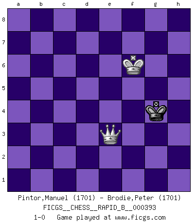 Last move : 1-0 2024 January 19 2:41:3 [Event "FICGS__CHESS__RAPID_B__000393"] [Site "FICGS"] [Date "2023.10.17"] [Round "1"] [White "Pintor,Manuel"] [Black "Brodie,Peter"] [Result "1-0"] [WhiteElo "1701"] [BlackElo "1701"] 1.e4 c5 2.f4 Nc6 3.Nf3 Nf6 4.Nc3 e6 5.e5 Nd5 6.Nxd5 exd5 7.d4 c4 8.c3 Be7 9.b3 b5 10.Be2 O-O 11.O-O d6 12.h3 Bf5 13.g4 Be4 14.g5 Bf5 15.Kh2 Qd7 16.Ng1 g6 17.Bg4 a5 18.Bxf5 Qxf5 19.Qf3 Qe4 20.Qf2 b4 21.Bd2 bxc3 22.Bxc3 Rfb8 23.bxc4 dxc4 24.Rae1 Qd5 25.h4 Nb4 26.Re2 Nd3 27.Qf3 Qxf3 28.Nxf3 Nxf4 29.Rb2 Rxb2+ 30.Bxb2 Rb8 31.Ba3 Rb6 32.Nd2 dxe5 33.Nxc4 Rc6 34.Nxe5 Rc2+ 35.Kh1 Bxa3 36.Rxf4 Bd6 37.a4 Ra2 38.Rxf7 Bxe5 39.Ra7 Rxa4 40.dxe5 Rxh4+ 41.Kg2 a4 42.Kf3 Rh3+ 43.Kg4 Ra3 44.e6 Kf8 45.Kf4 Ra2 46.Ke5 a3 47.Rxh7 Rf2 48.Ra7 a2 49.Ra8+ Ke7 50.Ra7+ Kd8 51.Kd6 Rd2+ 52.Ke5 Re2+ 53.Kf6 Rf2+ 54.Kxg6 Re2 55.e7+ Rxe7 56.Rxa2 Re1 57.Rf2 Re6+ 58.Rf6 Ke7 59.Rxe6+ Kxe6 60.Kh7 Kf7 61.g6+ Kf8 62.g7+ Ke7 63.g8Q Kf6 64.Qe8 Kf5 65.Kg7 Kf4 66.Kf6 Kg4 67.Qe3 1-0 Follow this game move after move (download)Fischer wanted to give the Russians a taste of their own medicine. (Larry Evans) Ich kenne Menschen, die allen Willen der Welt besitzen und doch nicht Schach spielen können. (Robert James Fischer) Morphy probablemente fue el genio más grande de todos. (Bobby Fischer) Toutes les manuvres exécutées sur une colonne ouverte ont pour but ultime l'intrusion définitive sur la septième ou la huitième rangée, en plein cur de la position ennemie. (Aaron Nimzovitch) Lamb in skin of tiger, still fears the wolf. (Chinese proverb)