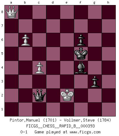 Last move : 0-1 2023 December 7 4:25:45 [Event "FICGS__CHESS__RAPID_B__000393"] [Site "FICGS"] [Date "2023.10.17"] [Round "1"] [White "Pintor,Manuel"] [Black "Vollmer,Steve"] [Result "0-1"] [WhiteElo "1701"] [BlackElo "1784"] 1.e4 c5 2.f4 Nc6 3.Nf3 e6 4.Bc4 Be7 5.O-O Nf6 6.d3 O-O 7.c3 d5 8.exd5 exd5 9.Bb3 a6 10.Ne5 Qc7 11.Nxc6 Qxc6 12.Qf3 g6 13.Nd2 Be6 14.Kh1 Qd7 15.Qg3 b5 16.Nf3 Rad8 17.Ne5 Qc8 18.h3 Rfe8 19.Bc2 d4 20.c4 Bf5 21.b3 h5 22.Bd1 Kg7 23.a4 b4 24.Bf3 Rd6 25.Be2 h4 26.Qxh4 Rh8 27.Qg3 Bxh3 28.Kg1 Bf5 29.Bd2 Rh6 30.Kf2 Qh8 31.Bf3 Nh5 32.Bxh5 Rxh5 33.Ke2 f6 34.Nf3 Re6+ 35.Kd1 Bd6 36.Kc2 g5 37.Rae1 Bxd3+ 38.Kc1 Rxe1+ 39.Rxe1 Bf5 40.Ng1 g4 41.Qf2 Qh7 42.Ne2 Qg6 43.Ng3 Rh8 44.Nxf5+ Qxf5 45.g3 Kf7 46.Qg2 Rd8 47.Qb7+ Qd7 48.Qxa6 Kg6 49.Qb5 Qxb5 50.cxb5 Kf5 51.Kc2 d3+ 52.Kd1 Rh8 53.Re3 Rh1+ 54.Be1 c4 55.bxc4 Bc5 56.Re8 Bf2 57.Kd2 Rxe1 58.Rxe1 Bxe1+ 59.Kxd3 Bxg3 60.b6 Bxf4 61.a5 g3 62.Ke2 b3 63.a6 b2 64.a7 b1Q 65.a8Q Qc2+ 0-1 Follow this game move after move (download)I don't believe in psychology. I believe in good moves. (Bobby Fischer) Glücklicherweise sind Großmeister Ruben Fines reine Schachbücher weniger phallozentrisch [als seine Schachpsychologie] und deswegen auch weniger lächerlich. (Nigel Short) Si yo gano un torneo, yo lo gano por mí mismo. Yo hago las jugadas. Nadie me ayuda. (Bobby Fischer) Le profane ne songe pas à la somme de jouissance dont il se prive, qui méconnaît ce jeu aux ressources aussi variées que passionnantes. (Jean-Marie Jeanton-Lamarche) No enterprise is more likely to succeed than one concealed from the enemy until it is ripe for execution. (Niccolo Machiavelli)