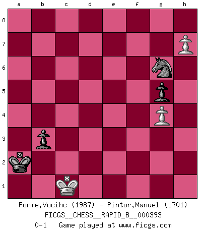 Last move : 0-1 2024 January 13 19:30:19 [Event "FICGS__CHESS__RAPID_B__000393"] [Site "FICGS"] [Date "2023.10.17"] [Round "1"] [White "Forme,Vocihc"] [Black "Pintor,Manuel"] [Result "0-1"] [WhiteElo "1987"] [BlackElo "1701"] 1.e4 e5 2.Nf3 Nc6 3.Bb5 Bc5 4.c3 Qf6 5.d4 exd4 6.e5 Nxe5 7.Qe2 c6 8.Bd3 d6 9.cxd4 Bb4+ 10.Bd2 Bxd2+ 11.Nbxd2 Bg4 12.dxe5 dxe5 13.Qxe5+ Be6 14.Ne4 Qxe5 15.Nxe5 O-O-O 16.O-O f6 17.Nxc6 Rxd3 18.Nxa7+ Kb8 19.Nc5 Rd6 20.Nb5 Rd5 21.Nxe6 Rxb5 22.b3 g5 23.Rfd1 Ne7 24.Rd7 Nc6 25.Re1 Re8 26.Rxh7 Nd4 27.Kf1 Rxe6 28.Rh8+ Ka7 29.Rxe6 Nxe6 30.Rh6 Rf5 31.a4 Nc5 32.Rh3 Re5 33.Rc3 Ka6 34.Rf3 f5 35.Re3 Rxe3 36.fxe3 Nxb3 37.Kf2 Nc5 38.Kf3 Ne6 39.h3 Ka5 40.g4 f4 41.exf4 Nxf4 42.Kg3 Ne6 43.h4 Kxa4 44.h5 Nf4 45.h6 b5 46.h7 Ng6 47.Kf3 b4 48.Ke2 b3 49.Kd2 Ka3 50.Kc1 Ka2 0-1 Follow this game move after move (download)There is only one thing Fischer does in Chess without pleasure: to lose ! (Boris Spassky) Ich habe Putins Aufstieg an die Macht beobachtet und seine Politik, die demokratischen Institutionen meines Landes zu zerstören. (Garry Kasparov) El Ajedrez expande y enriquece tu mente. (Saudin Robovic) Lorsque vous vous retrouvez devant une position atroce, ne tendez pas un ultime piège dérisoire avec l'intention d'abandonner si l'adversaire le déjoue ! Faites-vous plutôt un devoir de résister comme si votre vie en dépendait. Jouez le coup qui vous déplairait au centuple si vous étiez dans la peau de votre tortionnaire ! Convictions are more dangerous enemies of truth than lies. (Friedrich Nietzsche)