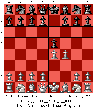 Last move : 1-0 2023 November 18 6:17:54 [Event "FICGS__CHESS__RAPID_B__000393"] [Site "FICGS"] [Date "2023.10.17"] [Round "1"] [White "Pintor,Manuel"] [Black "Biryukoff,Sergey"] [Result "1-0"] [WhiteElo "1701"] [BlackElo "1711"] 1.e4 e5 2.f4 1-0 This chess game has been lost on time (started : 2023.10.17 21:25:40) Follow this game move after move (download)When you play Bobby, it is not a question if you win or lose. It is a question if you survive. (Boris Spassky) Man wirke der falschen Auffassung entgegen, als ob jeder Zug Unmittelbares zu leisten habe; auch Werte- und Ruhezüge haben ihre Existenzberechtigung. (Aaron Nimzowitsch) Peones: ellos son el alma de esta partida, solos forman el ataque y la defensa. (Philidor) Psychologiquement, tu dois avoir confiance en toi même, mais cette confiance doit être basée sur des faits. (Robert Fischer) There is no instance of a country having benefited from prolonged warfare. (Sun Tzu)