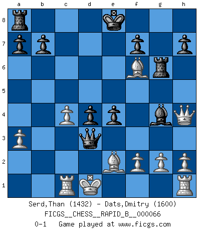 Last move : 0-1 2007 September 22 14:30:9 [Event "FICGS__CHESS__RAPID_B__000066"] [Site "FICGS"] [Date "2007.09.10"] [Round "1"] [White "Serd,Than"] [Black "Dats,Dmitry"] [Result "0-1"] [WhiteElo "1432"] [BlackElo "1600"] 1.e4 e6 2.d4 d5 3.Nc3 Bb4 4.a3 Bxc3+ 5.bxc3 dxe4 6.Qg4 Nf6 7.Qxg7 Rg8 8.Qh6 c5 9.Ne2 Rg6 10.Qh4 cxd4 11.cxd4 Nc6 12.c3 Qa5 13.Bd2 e5 14.c4 Qc7 15.Bg5 Nxd4 16.Nxd4 exd4 17.Bxf6 Qa5+ 18.Kd1 Bg4+ 19.Be2 Qc3 20.Rc1 Qd3+ 0-1 French : Winawer (Nimzovich) variation Player Black won this chess game. Follow this game move after move (download)Chess opens and enriches your mind. (Saudin Robovic) Zeige mir drei Eröffnungsvarianten und ich beweise dir, dass zwei davon inkorrekt sind. (Emanuel Lasker) Uno por uno, yo los acribillé, mi superioridad muy pronto se volvio aparente. (Jose Capablanca) Mais l'homme est une créature légère et illogique : semblable au joueur d'échecs, il n'aime que le processus du but à atteindre, non le but lui-même. (Dostoïevsky) A generalist learns less and less about more and more until he knows nothing about everything. (Author unknown)