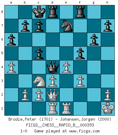 Last move : 1-0 2024 January 15 20:0:27 [Event "FICGS__CHESS__RAPID_B__000393"] [Site "FICGS"] [Date "2023.10.17"] [Round "1"] [White "Brodie,Peter"] [Black "Johansen,Jorgen"] [Result "1-0"] [WhiteElo "1701"] [BlackElo "2000"] 1.e4 e5 2.Nf3 Nc6 3.Bb5 a6 4.Bxc6 dxc6 5.Nc3 Bc5 6.O-O Bg4 7.d3 Bh5 8.Qd2 Bxf3 9.gxf3 Bd6 10.Qg5 Ne7 11.f4 exf4 12.Bxf4 Bxf4 13.Qxf4 Qd7 14.Rad1 Rf8 15.Kh1 O-O-O 16.Rg1 g6 17.a4 Qd4 18.f3 f5 19.Qd2 c5 20.Rge1 1-0 This chess game has been lost on time (started : 2023.10.17 21:25:40) Follow this game move after move (download)The hallmark of the artist is simplicity. (Larry Evans) Ja, jede Frau in Holland liebt mich bestimmt, und alle Männer hassen mich. (Loek van Wely) El Ajedrez es despiadado: debes de estar preparado para matar gente. (Nigel Short) Vouloir jouer aux échecs contre soi-même est aussi paradoxal que vouloir marcher sur son ombre. (Stefan Zweig) A government big enough to give you everything you want is strong enough to take everything you have. (Thomas Jefferson)