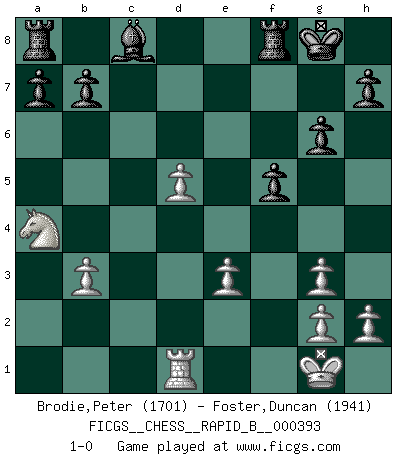 Last move : 1-0 2024 February 5 0:19:31 [Event "FICGS__CHESS__RAPID_B__000393"] [Site "FICGS"] [Date "2023.10.17"] [Round "1"] [White "Brodie,Peter"] [Black "Foster,Duncan"] [Result "1-0"] [WhiteElo "1701"] [BlackElo "1941"] 1.d4 f5 2.Bf4 Nf6 3.Nf3 d6 4.Nc3 g6 5.e3 Bg7 6.Be2 O-O 7.O-O Kh8 8.d5 c6 9.dxc6 Nxc6 10.a4 Qb6 11.b3 e5 12.Bg3 Ne7 13.a5 Qc5 14.Na4 Qxa5 15.Qd2 Qc7 16.c4 Ne4 17.Qd3 Nxg3 18.fxg3 e4 19.Qd2 exf3 20.Bxf3 Bxa1 21.Rxa1 Nc6 22.Bxc6 Qxc6 23.Rd1 Kg8 24.Qxd6 Qe4 25.Qd5+ Qxd5 26.cxd5 1-0 This chess game has been lost on time (started : 2023.10.17 21:25:40) Follow this game move after move (download)No other master has such a terrific will to win. At the board he radiates danger, and even the strongest opponents tend to freeze, like rabbits when they smell a panther. Even his weaknesses are dangerous. As white, his opening game is predictable - you can make plans against it - but so strong that your plans almost never work. In the middle game his precision and invention are fabulous, and in the end game you simply cannot beat him. (Anonymous German Expert) Ein Buch ist ein Spiegel; wenn ein Affe hineinsieht, so kann kein Apostel heraus gucken. (Georg Christoph Lichtenberg) Al jugar al Ajedrez entonces, podemos aprender: Primero: Previsión... Segundo: Prudencia... Tercero: Cautela... Y al final, aprendemos del Ajedrez el hábito de no ser desanimados por apariencias malas presentes en el estado de nuestros asuntos, el hábito de la esperanza por una oportunidad favorable y la perseveración de los secretos de los recursos. (Benjamin Franklin) Le succès, c'est être capable d'aller d'échec en échec sans perdre son enthousiasme. (Winston Churchill) All art requires courage. (Anne Tucker)