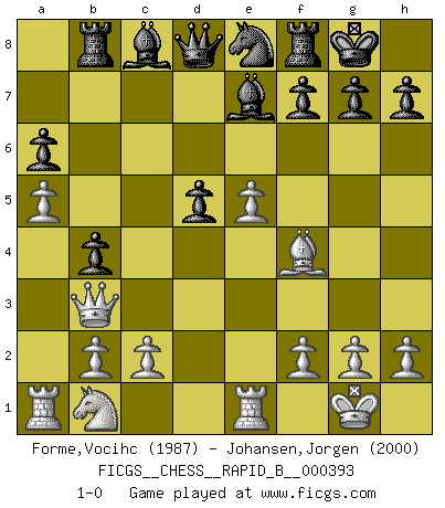 Last move : 1-0 2024 January 9 13:7:4 [Event "FICGS__CHESS__RAPID_B__000393"] [Site "FICGS"] [Date "2023.10.17"] [Round "1"] [White "Forme,Vocihc"] [Black "Johansen,Jorgen"] [Result "1-0"] [WhiteElo "1987"] [BlackElo "2000"] 1.e4 e5 2.Nf3 Nc6 3.Bb5 a6 4.Ba4 Nf6 5.O-O Be7 6.Re1 b5 7.Bb3 O-O 8.d4 Nxd4 9.Nxd4 exd4 10.Qxd4 c5 11.Qc3 c4 12.e5 Ne8 13.a4 cxb3 14.Qxb3 b4 15.a5 d5 16.Bd2 Rb8 17.Bf4 1-0 This chess game has been lost on time (started : 2023.10.17 21:25:40) Follow this game move after move (download)You are for me the Queen on d8 and I am the Pawn on d7 !! (Eduard Gufeld) Ein Teil des Fehlers ist immer korrekt. (Savielly Grigorievitsch Tartakower) El Ajedrez moderno está demasiado preocupado con cosas como la estructura de Peones. Olvidenlo, el Jaque Mate termina la partida. (Nigel Short) La victoire dans une partie d'Echecs appartient la plupart du temps à celui qui voit un peu plus loin que l'adversaire. (Lasker) Heh, heh, heh. Time to abandon ship. (General Grievous in Star Wars ep.3)