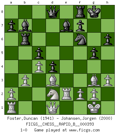 Last move : 1-0 2024 January 10 13:12:31 [Event "FICGS__CHESS__RAPID_B__000393"] [Site "FICGS"] [Date "2023.10.17"] [Round "1"] [White "Foster,Duncan"] [Black "Johansen,Jorgen"] [Result "1-0"] [WhiteElo "1941"] [BlackElo "2000"] 1.e4 e5 2.Nf3 Nc6 3.d4 exd4 4.Nxd4 Nf6 5.Nxc6 bxc6 6.Bd3 d5 7.exd5 cxd5 8.O-O Be7 9.c4 O-O 10.Bg5 Rb8 11.b3 h6 12.Bh4 d4 13.Nd2 c5 14.Re1 Rb6 15.h3 Bb7 16.Re2 g5 17.Bg3 1-0 This chess game has been lost on time (started : 2023.10.17 21:25:40) Follow this game move after move (download)When I asked Fischer why he had not played a certain move in our game, he replied: 'Well, you laughed when I wrote it down !' (Mikhail Tal) Ich glaube nicht an Psychologie, ich glaube an gute Züge. (Robert James Fischer) Te sientas frente a un tablero y repentinamente tu corazón brinca. Tu mano tiembla al tomar una pieza y moverla. Pero lo que el Ajedrez te enseña es que tu debes permanecer ahí con calma y pensar de que si realmente es una buena idea o de que si hay otras ideas mejores. (Stanley Kubrick) L'action d'une oeuvre littéraire se déroule sur un champ de bataille. Les masques et les types du drame moderne correspondent aux pièces du jeu d'échecs. L'intrigue correspond aux coups et aux gambits, c'est à dire aux techniques du jeu telles qu'utilisées et interprétées par les joueurs. Les tactiques et les péripéties [mouvements] correspondent aux coups exécutés par l'adversaire. (Viktor Shklovsky) There are three kinds of lies: lies, damned lies and statistics. (Mark Twain)