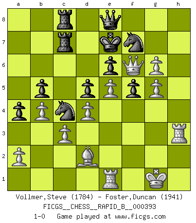 Last move : 1-0 2024 January 17 18:52:29 [Event "FICGS__CHESS__RAPID_B__000393"] [Site "FICGS"] [Date "2023.10.17"] [Round "1"] [White "Vollmer,Steve"] [Black "Foster,Duncan"] [Result "1-0"] [WhiteElo "1784"] [BlackElo "1941"] 1.e4 c6 2.Nf3 d5 3.exd5 cxd5 4.d4 Nc6 5.Be2 Bg4 6.O-O e6 7.c3 Bd6 8.Be3 Nge7 9.Nbd2 O-O 10.h3 Bh5 11.Nh4 Bxe2 12.Qxe2 f6 13.f4 Qd7 14.g4 f5 15.Rae1 Kh8 16.g5 Nd8 17.Ndf3 Qa4 18.b3 Qe8 19.Ne5 a5 20.Bd2 Ndc6 21.Nd3 Nd8 22.Ng2 a4 23.b4 Nc8 24.Nc5 Rf7 25.h4 Re7 26.Rf3 Nb6 27.Rh3 Nc4 28.Bc1 b6 29.Nd3 Rc8 30.Ne5 Bxe5 31.fxe5 b5 32.Nf4 Nb6 33.h5 Rec7 34.Bd2 Nc4 35.Ng6+ hxg6 36.hxg6 Kg8 37.Qh5 Kf8 38.Qh8+ Ke7 39.Qxg7+ Nf7 40.Qf6+ 1-0 Follow this game move after move (download)Not only will I predict his triumph over Botvinnik, but I'll go further and say that he'll probably be the greatest Chess player that ever lived. (John Collins) Habe Mut, dich deines eigenen Verstandes zu bedienen. (Immanuel Kant) Coloca el contenido de las piezas del Ajedrez en un sombrero, agitalo vigorosamente, arrojalas en un tablero desde una altura de 30 centimetros y así obtendras el estilo de Steinitz. (H. E. Bird) Vous m'avez demandé de vous exposer quel est le fondement de la prière. Je ne fais que préparer les pièces du jeu sur la table... Nous sera-t-il permis d'en adopter les règles et si nous les appliquons scrupuleusement nous ne tarderons pas à faire mat le Roi divin ! Il ne pourra échapper à nos mains. (Sainte Thérèse d'Avila, Chemin de perfection) Depression is just anger without enthusiasm. (Unknown)