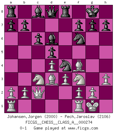 Last move : 0-1 2024 March 12 14:36:57 [Event "FICGS__CHESS__CLASS_A__000274"] [Site "FICGS"] [Date "2023.10.18"] [Round "1"] [White "Johansen,Jorgen"] [Black "Pech,Jaroslav"] [Result "0-1"] [WhiteElo "2000"] [BlackElo "2106"] 1.d4 d5 2.c4 e6 3.Nc3 Nf6 4.cxd5 exd5 5.Bg5 c6 6.e3 Nbd7 7.Bd3 Be7 8.Qc2 O-O 9.h3 Re8 10.Nf3 Ne4 11.Bf4 Ndf6 12.O-O Bd6 0-1 Follow this game move after move (download)During a Chess competition a Chessmaster should be a combination of a beast of prey and a monk. (Alexander Alekhine) Ich habe kein Problem mit Frauen, sondern nur mit dem Niveau ihres Schachspiels (Judith Polgar) En el tablero, la mentira e hipocresía no sobreviven mucho. (Emanuel Lasker) Seul un grand joueur sait à quel point il joue faiblement. (Xavier Tartacover) The ego is not master in its own house. (Sigmund Freud)