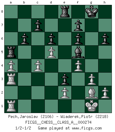 Last move : 1/2-1/2 2024 May 11 16:46:54 [Event "FICGS__CHESS__CLASS_A__000274"] [Site "FICGS"] [Date "2023.10.18"] [Round "1"] [White "Pech,Jaroslav"] [Black "Wiaderek,Piotr"] [Result "1/2-1/2"] [WhiteElo "2106"] [BlackElo "2218"] 1.c4 e5 2.Nc3 Nf6 3.Nf3 Nc6 4.g3 Bb4 5.Bg2 O-O 6.O-O e4 7.Ne1 Bxc3 8.dxc3 h6 9.Nc2 Re8 10.Ne3 d6 11.b3 a5 12.a4 Qe7 13.Nd5 Nxd5 14.cxd5 Nb8 15.Be3 Nd7 16.Qc2 Nf8 17.b4 Bf5 18.Bd4 Qg5 19.bxa5 Rxa5 20.c4 b6 21.Bc3 e3 22.Qb2 R5a8 23.f4 Qg6 24.Bd4 Nd7 25.Ra3 Nf6 26.Bxf6 Qxf6 27.Qxf6 gxf6 28.Rfa1 Ra5 1/2-1/2 Follow this game move after move (download)You may learn much more from a game you lose than from a game you win. You will have to lose hundreds of games before becoming a good player. (Jose Raul Capablanca) Ich las kürzlich ein Buch von Nietzsche. Er sagte Religion verdumme nur die Menschen. Ich stimme zu. (Robert James Fischer) El Ajedrez es la vida. (Bobby Fischer) Les Echecs ont trois composantes : le temps, l'espace et le matériel en dernier. (Mikhail Tal) The only sure thing about luck is that it will change. (Wilson Mizner)