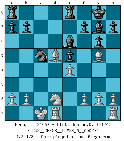 Last move : 1/2-1/2 2024 January 20 2:6:54 [Event "FICGS__CHESS__CLASS_A__000274"] [Site "FICGS"] [Date "2023.10.18"] [Round "1"] [White "Pech,Jaroslav"] [Black "Cleto Junior,Dirceu"] [Result "1/2-1/2"] [WhiteElo "2106"] [BlackElo "2124"] 1.d4 Nf6 2.c4 g6 3.Nc3 Bg7 4.e4 d6 5.Nf3 O-O 6.Be2 e5 7.dxe5 dxe5 8.Qxd8 Rxd8 9.Bg5 Re8 10.Nd5 Nxd5 11.cxd5 c6 12.Bc4 cxd5 13.Bxd5 Nd7 14.Nd2 Nc5 15.O-O-O Be6 1/2-1/2 Follow this game move after move (download)In Fischer's hands, a slight theoretical advantage is as good a being a Queen ahead. (Isaac Kashdan) Kasparov stellt für gewöhnlich die Regeln auf und bricht sie dann selbst wieder. (Alexej Shirov) Después de la respuesta de las negras a 1.e4 con 1..e5, se quedan siempre tratando de entrar dentro del juego. (Howard Staunton) Dans le domaine de la peinture, de la gravure et de la sculpture, dès la première décennie de notre siècle, les artistes abandonnent la représentation de la partie d'échecs pour se concentrer sur les pièces, sur les échiquiers et sur toutes les variations auxquelles les unes et les autres peuvent donner lieu. On passe en quelque sorte d'un thème social à un thème musical (au sens de la musica médiévale, c'est-à-dire d'une notion qui inclue le rythme, l'harmonie, la construction et la déconstruction, etc.). Graphiquement et picturalement, l'échiquier apparaît comme une structure ouverte, dynamique, d'une richesse infinie, autorisant toutes les combinatoires et débouchant sur des mouvements et des rythmes de nature exponentielle. (Michel Pastoureau) Macintosh - we might not get everything right, but at least we knew the century was going to end. (Douglas Adams)