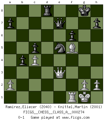 Last move : 0-1 2024 March 2 9:56:50 [Event "FICGS__CHESS__CLASS_A__000274"] [Site "FICGS"] [Date "2023.10.18"] [Round "1"] [White "Ramirez,Eliecer"] [Black "Knittel,Martin"] [Result "0-1"] [WhiteElo "2040"] [BlackElo "2001"] 1.Nf3 d5 2.c4 d4 3.b4 c5 4.e3 dxe3 5.fxe3 cxb4 6.d4 Nf6 7.Be2 e6 8.Qd3 Be7 9.O-O O-O 10.e4 Nfd7 11.e5 f6 12.exf6 Bxf6 13.Be3 e5 14.Nbd2 exd4 15.Bxd4 Nc6 16.Ne4 Bxd4+ 17.Nxd4 Nde5 18.Nxc6 bxc6 19.Rxf8+ Qxf8 20.Qe3 Bg4 21.Rf1 Qe7 22.Nf6+ gxf6 23.Bxg4 Rd8 24.Bf5 c5 0-1 Follow this game move after move (download)Look at Garry Kasparov. After he loses, invariably he wins the next game. He just kills the next guy. That's something that we have to learn to be able to do. (Maurice Ashley) Wenn Du absolut nicht mehr weißt, was Du tun sollst, dann ist es Zeit für Panik. (John van der Wiel) Diferente gente reacciona diferentemente en aceptar la derrota. (Bobby Fischer) Horreur, mais aussi harmonie suprême : qu'y avait-il en effet au monde en dehors des échecs ? Le brouillard, l'inconnu, le non-être... (Vladimir Nabokov) There is no vagueness without wind. (Chinese proverb)