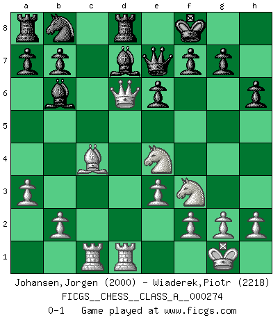 Last move : 0-1 2024 January 28 0:58:22 [Event "FICGS__CHESS__CLASS_A__000274"] [Site "FICGS"] [Date "2023.10.18"] [Round "1"] [White "Johansen,Jorgen"] [Black "Wiaderek,Piotr"] [Result "0-1"] [WhiteElo "2000"] [BlackElo "2218"] 1.d4 Nf6 2.c4 e6 3.Nf3 d5 4.Nc3 Bb4 5.Bg5 h6 6.Bxf6 Qxf6 7.e3 O-O 8.Rc1 dxc4 9.Bxc4 c5 10.O-O cxd4 11.Ne4 Qe7 12.a3 Ba5 13.Qxd4 Rd8 14.Qe5 Bb6 15.Rfd1 Bd7 16.Qd6 Kf8 0-1 This chess game has been lost on time (started : 2023.10.18 7:51:55) Follow this game move after move (download)Robert Fischer is a law unto himself. (Larry Evans) Ich suche im Schach immer etwas Eigenes. Riskantes Spiel im Stile schachlicher Musketiere ist nicht meine Sache, auch wenn es vielen Freunden scharfer Wendungen gefällt. (Anatoly Karpov) Coloca el contenido de las piezas del Ajedrez en un sombrero, agitalo vigorosamente, arrojalas en un tablero desde una altura de 30 centimetros y así obtendras el estilo de Steinitz. (H. E. Bird) Fischer est le meilleur joueur du monde et Karpov n'est qu'un joueur de bistrot. (Garry Kasparov, agé de 16 ans) This is where the fun begins. (Anakin Skywalker in Star Wars ep.3)