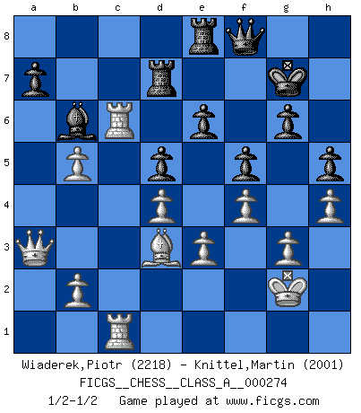 Last move : 1/2-1/2 2024 March 21 20:9:58 [Event "FICGS__CHESS__CLASS_A__000274"] [Site "FICGS"] [Date "2023.10.18"] [Round "1"] [White "Wiaderek,Piotr"] [Black "Knittel,Martin"] [Result "1/2-1/2"] [WhiteElo "2218"] [BlackElo "2001"] 1.d4 Nf6 2.c4 e6 3.Nf3 d5 4.g3 Bb4+ 5.Bd2 Be7 6.Bg2 O-O 7.O-O c6 8.Qc2 Nbd7 9.Bf4 b6 10.cxd5 cxd5 11.Rc1 Bb7 12.Bc7 Qe8 13.Qb3 Ne4 14.Nc3 Ndf6 15.Nb5 Ba6 16.a4 Bxb5 17.axb5 Nd6 18.Bxd6 Bxd6 19.Rc6 Qe7 20.Ne5 g6 21.h4 Nd7 22.f4 Nf6 23.Rc2 Qb7 24.Qd3 Kg7 25.Nc6 h5 26.Ra6 Rfc8 27.Rc1 Rc7 28.Rca1 Qc8 29.Qd1 Qe8 30.Qb3 Qf8 31.Bf3 Nd7 32.Kf1 Nb8 33.Rxb6 Nxc6 34.Rxc6 Rd7 35.e3 Rb8 36.Be2 Be7 37.Qc3 Bd8 38.Kg2 Qe8 39.Rc1 Qf8 40.Ra1 Qe8 41.Kh3 Qf8 42.Rc1 Bb6 43.Bd3 Re8 44.Qa3 f5 45.Kg2 1/2-1/2 Follow this game move after move (download)We must make sure that Chess will not be like a dead language, very interesting, but for a very small group. (Sytze Faber) Ein guter Spieler hat immer Glück. (José Raúl Capablanca) Me dio la sensación de como si yo estuviera jugando en contra del mismo Ajedrez. - al estar jugando en contra de Robert Fischer (Walter Shipman) Aux échecs, les retours au sommet sont rares : les dommages psychologiques consécutifs à une défaite sont trop sévères. (Daily Telegraph) The difference between stupidity and genius is that genius has its limits. (Murphy)