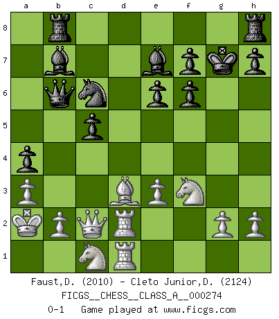 Last move : 0-1 2023 November 28 8:28:14 [Event "FICGS__CHESS__CLASS_A__000274"] [Site "FICGS"] [Date "2023.10.18"] [Round "1"] [White "Faust,Dieter"] [Black "Cleto Junior,Dirceu"] [Result "0-1"] [WhiteElo "2010"] [BlackElo "2124"] 1.d4 Nf6 2.Bg5 d5 3.e3 c5 4.Bxf6 gxf6 5.dxc5 e6 6.Nf3 Bxc5 7.Nbd2 Nc6 8.a3 Be7 9.c4 d4 10.Qc2 dxe3 11.fxe3 b6 12.O-O-O Bb7 13.Kb1 Qc7 14.c5 bxc5 15.Nb3 Qb6 16.Bd3 Rb8 17.Ka2 Kf8 18.Rd2 Kg7 19.Rhd1 a5 20.Nc1 a4 0-1 Follow this game move after move (download)A bad plan is better than none at all. (Frank Marshall) Oft bringt ein stiller Zug das Erdbeben. (Richard Reti) Vive, pierde y aprende al observar a tu oponente como gana. (Amber Steenbock) Un journaliste : 'Vous préférez avoir une dame de plus sur l'échiquier ou au lit ?' Boris Spassky : 'Ca dépend de la position.' Warrior pose battles inner weakness and wins focus. You see that there is no war within you. You're on your own side, and you are your own strength. (Terri Guillemets)