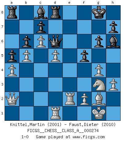 Last move : 1-0 2024 January 29 11:21:35 [Event "FICGS__CHESS__CLASS_A__000274"] [Site "FICGS"] [Date "2023.10.18"] [Round "1"] [White "Knittel,Martin"] [Black "Faust,Dieter"] [Result "1-0"] [WhiteElo "2001"] [BlackElo "2010"] 1.c4 Nf6 2.Nf3 e6 3.g3 b6 4.Bg2 Bb7 5.d4 Be7 6.Nc3 O-O 7.O-O Ne4 8.Bd2 Bf6 9.Be1 Nxc3 10.Bxc3 d5 11.cxd5 exd5 12.b4 Nd7 13.b5 Re8 14.e3 Nc5 15.dxc5 Bxc3 16.Rc1 Bb4 17.c6 Bc8 18.Qb3 Bc5 19.Nd4 Be6 20.Rfd1 Qd6 21.Qa4 Qe5 22.Rd3 g6 23.Rcd1 Kg7 24.Nb3 Red8 25.h3 Be7 26.Nd4 Bc5 27.Ne2 Qb2 28.Nd4 Qb4 29.Qc2 Bf8 30.e4 Bc8 31.exd5 Kg8 32.Re3 a6 33.a4 a5 34.g4 Qc5 35.Qa2 Qb4 36.Ne2 Bh6 37.Re4 Qd6 38.Ng3 f5 39.Re2 1-0 Follow this game move after move (download)Chess, like any creative activity, can exist only through the combined efforts of those who have creative talent, and those who have the ability to organize their creative work. (Mikhail Botvinnik) Ein Buch ist ein Spiegel; wenn ein Affe hineinsieht, so kann kein Apostel heraus gucken. (Georg Christoph Lichtenberg) Un jugador que es sorprendido, esta derrotado a medias. (Proverbio) Karpov est une pièce de musée. (Garry Kasparov) Those who make the worst use of their time are the first to complain of its brevity. (Jean de la Bruyere)