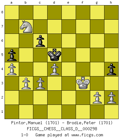 Last move : 1-0 2024 April 25 15:4:42 [Event "FICGS__CHESS__CLASS_D__000298"] [Site "FICGS"] [Date "2023.10.18"] [Round "1"] [White "Pintor,Manuel"] [Black "Brodie,Peter"] [Result "1-0"] [WhiteElo "1701"] [BlackElo "1701"] 1.e4 e6 2.f4 d5 3.exd5 exd5 4.d4 f5 5.Nf3 Nf6 6.Bd3 Nc6 7.O-O Be7 8.c3 O-O 9.Ne5 Ne4 10.Qh5 Qe8 11.Qh3 Nf6 12.Bxf5 Bxf5 13.Qxf5 g6 14.Qh3 Nxe5 15.fxe5 Ne4 16.Qe6+ Kh8 17.Qxd5 Rxf1+ 18.Kxf1 Ng5 19.e6 c6 20.Qe5+ Kg8 21.Bxg5 Bxg5 22.Qxg5 Qxe6 23.Nd2 Re8 24.Kg1 Qf7 25.Nf3 Qf5 26.Qxf5 gxf5 27.Ne5 h5 28.Rf1 Rf8 29.Ng6 Rf7 30.Nh4 f4 31.Ng6 Kg7 32.Nxf4 h4 33.Ne6+ Kg6 34.Rxf7 Kxf7 35.Nd8+ Ke7 36.Nxb7 Ke6 37.Kf2 Kf5 38.Kf3 a6 39.a4 Ke6 40.Nc5+ Kd5 41.b3 a5 42.Nb7 1-0 Follow this game move after move (download)Via the squares on the chessboard, the Indians explain the movement of time and the age, the higher influences which control the world and the ties which link Chess with the human soul. (Al-Masudi) Ein Teil des Fehlers ist immer korrekt. (Savielly Grigorievitsch Tartakower) La vida es como el Ajedrez, con lucha, competición y eventos buenos y malos. (Benjamin Franklin) Les Echecs représentent une sphère d'idées créatrices basée sur la volonté des deux protagonistes. (Smyslov) A specialist learns more and more about less and less until he knows everything about nothing. (Nicholas Murray Butler)