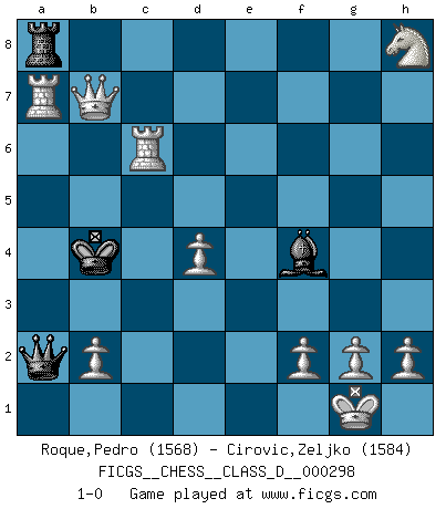 Last move : 1-0 2023 December 5 7:48:38 [Event "FICGS__CHESS__CLASS_D__000298"] [Site "FICGS"] [Date "2023.10.18"] [Round "1"] [White "Roque,Pedro"] [Black "Cirovic,Zeljko"] [Result "1-0"] [WhiteElo "1568"] [BlackElo "1584"] 1.e4 c6 2.d4 d5 3.e5 Bf5 4.Be2 e6 5.Nf3 Be7 6.O-O f6 7.c4 Bxb1 8.Rxb1 dxc4 9.Bxc4 Nd7 10.Bxe6 Nf8 11.Bc4 fxe5 12.Nxe5 Ng6 13.Bf7+ Kf8 14.Bxg6 hxg6 15.Nxg6+ Ke8 16.Nxh8 Qd5 17.Re1 Kd7 18.Re5 Qxa2 19.Bf4 Bd6 20.Qg4+ Kc7 21.Rc1 Nf6 22.Qxg7+ Nd7 23.Re7 Bxf4 24.Rxd7+ Kb6 25.Rxb7+ Ka6 26.Rxc6+ Ka5 27.Rxa7+ Kb4 28.Qb7+ 1-0 Follow this game move after move (download)You know, comrade Pachman, I don't enjoy being a Minister, I would rather play Chess like you. (Che Guevara) Das Zentrum ist der Balkan des Schachbretts - Kriegshandlungen können in jedem Moment ausbrechen. (Aaron Nimzowitsch) La vida es como el Ajedrez, con lucha, competición y eventos buenos y malos. (Benjamin Franklin) Il s'avisa de me proposer d'apprendre les échecs qu'il jouait un peu... me voilà forcené des échecs. J'achète un échiquier, je m'enferme dans ma chambre, j'y passe des jours et des nuits à vouloir apprendre par cur toutes les parties. (Jean-Jacques Rousseau, Confessions) It's only after you lost everything, Tyler says, that you're free to do anything. (Chuck Palahniuk, Fight Club)