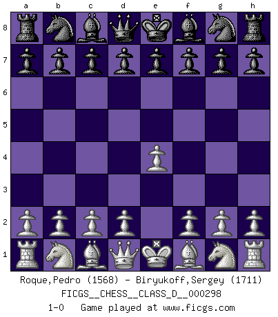Last move : 1-0 2023 November 29 23:29:15 [Event "FICGS__CHESS__CLASS_D__000298"] [Site "FICGS"] [Date "2023.10.18"] [Round "1"] [White "Roque,Pedro"] [Black "Biryukoff,Sergey"] [Result "1-0"] [WhiteElo "1568"] [BlackElo "1711"] 1.e4 1-0 This chess game has been lost on time (started : 2023.10.18 8:2:48) Follow this game move after move (download)An attack on the wing should be met by play in the center. (Nimzovitch) Ich bewundere Kasparows phantasievolle Angriffssiege aus den Achtzigern und Neunzigern, aber wenn man sie mit dem Computer überprüft, nimmt der Computer in jeder zweiten Partie die Opfer an, verteidigt sich und gewinnt. (Vladimir Kramnik) Ciertamente, de todas la drogas del mundo, el Ajedrez debe ser el mas placentero permamentemente. (Assiac) Les Echecs sont affaire de jugement sensible. Savoir quand frapper et quand esquiver. (Fischer) God is an atheist. (Unknown)