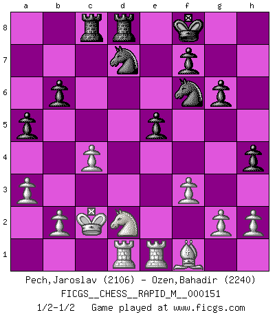 Last move : 1/2-1/2 2023 December 23 11:52:28 [Event "FICGS__CHESS__RAPID_M__000151"] [Site "FICGS"] [Date "2023.10.18"] [Round "1"] [White "Pech,Jaroslav"] [Black "Ozen,Bahadir"] [Result "1/2-1/2"] [WhiteElo "2106"] [BlackElo "2240"] 1.e4 c5 2.Nf3 d6 3.d4 cxd4 4.Nxd4 Nf6 5.Nc3 a6 6.Be3 e5 7.Nb3 Be6 8.f3 h5 9.Qd2 Nbd7 10.Nd5 Bxd5 11.exd5 g6 12.O-O-O Nb6 13.Kb1 Nfxd5 14.Bg5 Be7 15.Bxe7 Qxe7 16.c4 Nf6 17.Qxd6 Qxd6 18.Rxd6 Nbd7 19.Be2 Ke7 20.R6d1 Rac8 21.Rhe1 Rhd8 22.Bf1 b6 23.Nd2 a5 24.a3 Kf8 25.Kc2 h4 1/2-1/2 Follow this game move after move (download)When you play Bobby, it is not a question if you win or lose. It is a question if you survive. (Boris Spassky) Der Freibauer hat für mich eine Seele, genau wie der Mensch, Wünsche, die unerkannt in ihm schlummern, und Befürchtungen, von deren Existenz er selbst kaum ahnt. (Aaron Nimzowitsch) Hay dos clases de hombres: aquellos que se conforman en dejarse llevar por las circunstancias y que juegan barajas y aquellos decididos a controlar las circunstancias y que juegan al Ajedrez. (Mortimer Collins) Il (Jacob Murray) ne joue pas pour le bon coup, mais pour le meilleur. (Eloi Relange) A bird doesn't sing because it has an answer, it sings because it has a song. (Maya Angelou)