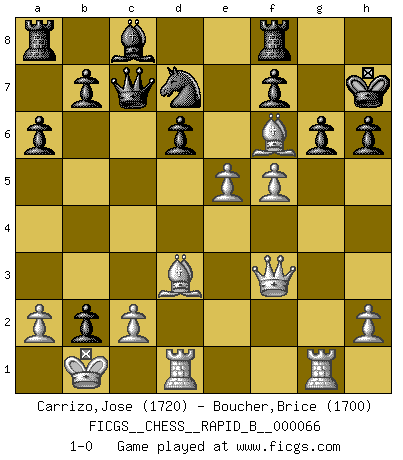Last move : 1-0 2007 November 22 17:57:0 [Event "FICGS__CHESS__RAPID_B__000066"] [Site "FICGS"] [Date "2007.09.10"] [Round "1"] [White "Carrizo,Jose"] [Black "Boucher,Brice"] [Result "1-0"] [WhiteElo "1720"] [BlackElo "1700"] 1.e4 c5 2.Nf3 d6 3.d4 cxd4 4.Nxd4 Nf6 5.Nc3 a6 6.Bg5 e6 7.f4 Be7 8.Qf3 Qc7 9.O-O-O h6 10.Bh4 O-O 11.g4 e5 12.g5 exd4 13.gxf6 dxc3 14.Rg1 cxb2+ 15.Kb1 Bxf6 16.Bxf6 g6 17.f5 Kh7 18.Bd3 Nd7 19.e5 1-0 Sicilian : Najdorf, 7...Be7 Queenside Castling by player White (move 9) Kingside Castling by player Black (move 10) Player White won this chess game. Follow this game move after move (download)The hardest game to win is a won game. (Emanuel Lasker) Warum muß ich gegen diesen IDIOTEN verlieren? (Aaron Nimzowitsch) Una compensación adecuada por un sacrificio es tener una combinación sólida que conduce a una posición ganadora; una compensación adecuada por una metida de pata es dejar a tu oponente arrebatar una derrota de las fauces de la victoria. (Bruce A. Moon) Même si vous avez un bon coup à faire, regardez toujours s'il n'y en a pas un qui lui soit préférable. (Pedro Damiano) A good teacher is like a candle - it consumes itself to light the way for others. (Author unknown)