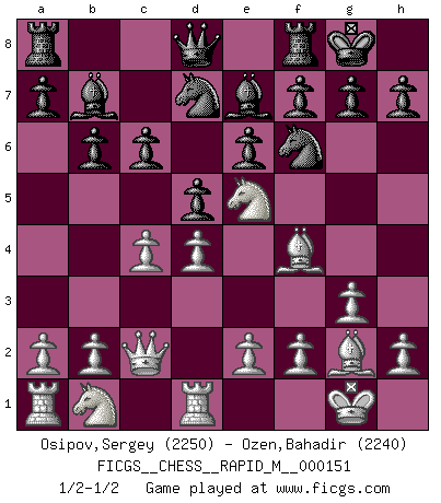 Last move : 1/2-1/2 2023 October 23 8:13:49 [Event "FICGS__CHESS__RAPID_M__000151"] [Site "FICGS"] [Date "2023.10.18"] [Round "1"] [White "Osipov,Sergey"] [Black "Ozen,Bahadir"] [Result "1/2-1/2"] [WhiteElo "2250"] [BlackElo "2240"] 1.d4 Nf6 2.c4 e6 3.Nf3 d5 4.g3 Bb4+ 5.Bd2 Be7 6.Bg2 O-O 7.O-O c6 8.Qc2 b6 9.Rd1 Nbd7 10.Bf4 Bb7 11.Ne5 Nh5 12.Bd2 Nhf6 13.Bf4 1/2-1/2 Follow this game move after move (download)No Chess Grandmaster is normal; they only differ in the extent of their madness. (Viktor Korchnoi) Mein erstes Ziel war nicht, die Partie zu gewinnen, sondern eine Figur zu opfern. -- der junge (Wilhelm Steinitz) El juego del Ajedrez no es solamente una diversión quieta; algunas cualidades muy valuables de la mente se pueden adquirir y cultivar con el, como convertirlos en habitos disponibles para toda ocasión; ya que la vida es algo así como el Ajedrez. (Benjamin Franklin) Les échecs sont plus proches de l'art de l'assassinat que de l'art de la guerre. (Arturo Perez-Reverte) Life is pain my dear and anyone who says otherwise is selling something. (Princess Bride)