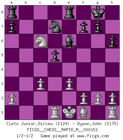 Last move : 1/2-1/2 2023 November 17 12:17:10 [Event "FICGS__CHESS__RAPID_M__000151"] [Site "FICGS"] [Date "2023.10.18"] [Round "1"] [White "Cleto Junior,Dirceu"] [Black "Dyson,John"] [Result "1/2-1/2"] [WhiteElo "2124"] [BlackElo "2175"] 1.d4 Nf6 2.c4 e6 3.Nf3 d5 4.Nc3 Bb4 5.Bg5 h6 6.Bxf6 Qxf6 7.Qb3 c5 8.cxd5 O-O 9.dxc5 Bxc3+ 10.Qxc3 Qxc3+ 11.bxc3 exd5 12.Nd4 Be6 13.Rd1 Nd7 14.c6 bxc6 15.Nxc6 Rfe8 16.e3 1/2-1/2 Follow this game move after move (download)No other master has such a terrific will to win. At the board he radiates danger, and even the strongest opponents tend to freeze, like rabbits when they smell a panther. Even his weaknesses are dangerous. As white, his opening game is predictable - you can make plans against it - but so strong that your plans almost never work. In the middle game his precision and invention are fabulous, and in the end game you simply cannot beat him. (Anonymous German Expert) Kein Schachspieler kann gut schlafen. (H. G. Wells) Cada Peón es una Reina en potencia. (James Mason) Les échecs sont un jeu terrible. Si vous n'avez pas le centre, votre adversaire a une position plus libre. Par contre, si vous avez le centre, alors vous avez vraiment quelque chose pour laquelle vous inquiéter ! (Siegbert Tarrasch) Wikichess, chess moves explained by 'experimented' players. (Thibault de Vassal)