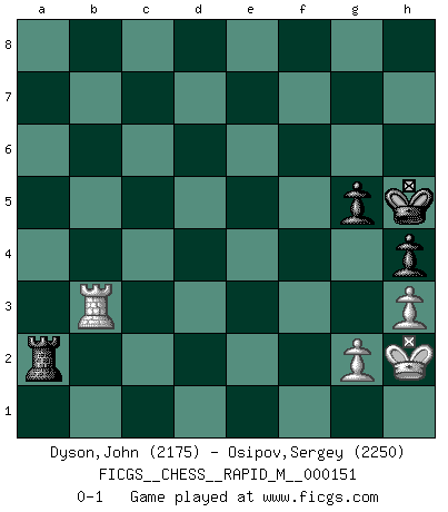 Last move : 0-1 2024 February 5 0:19:31 [Event "FICGS__CHESS__RAPID_M__000151"] [Site "FICGS"] [Date "2023.10.18"] [Round "1"] [White "Dyson,John"] [Black "Osipov,Sergey"] [Result "0-1"] [WhiteElo "2175"] [BlackElo "2250"] 1.e4 e5 2.Nf3 Nc6 3.Bc4 Nf6 4.d3 Bc5 5.O-O O-O 6.c3 d6 7.h3 a6 8.b4 Ba7 9.a4 Ne7 10.Re1 c6 11.Nbd2 d5 12.Bb3 Ng6 13.exd5 Nxd5 14.Ne4 Bf5 15.Ng3 Be6 16.Bd2 Re8 17.Bc2 Qc7 18.Ng5 Rad8 19.Bb3 Bc8 20.c4 Ndf4 21.c5 Rf8 22.Nh5 Ne6 23.Bxe6 Bxe6 24.Nxe6 fxe6 25.Ng3 Rxd3 26.Qc2 Qd7 27.Ne4 Rd5 28.Be3 Ne7 29.b5 cxb5 30.Ng5 Rf5 31.axb5 Bxc5 32.Bxc5 Rxg5 33.Bxe7 Qxe7 34.bxa6 bxa6 35.Rxa6 Rf5 36.Rea1 Rf8 37.R1a3 Rd4 38.Qa2 Rd1+ 39.Kh2 Rd6 40.R6a4 Rd4 41.Ra6 Qf7 42.Rg3 g6 43.Ra7 Qf6 44.Qb3 e4 45.Qb7 Rf7 46.Qb8+ Qd8 47.Qxd8+ Rxd8 48.Ra2 Rd4 49.Re3 Kg7 50.Rae2 Rf5 51.Rxe4 Rxe4 52.Rxe4 Rxf2 53.Rxe6 g5 54.Kg3 Ra2 55.Re7+ Kg6 56.Re3 h5 57.Rb3 h4+ 58.Kh2 Kh5 0-1 This chess game has been lost on time (started : 2023.10.18 11:29:41) Follow this game move after move (download)In complicated positions, Bobby Fischer hardly had to be afraid of anybody. (Paul Keres) Das Schach hält seine Meister in eigenen Banden, Fesseln; auf vielerlei Weise formt es ihren Geist, so dass die innere Freiheit selbst des Stärksten beeinflusst wird. (Albert Einstein) La caracteristica mas importante en la posición del Ajedrez es la actividad de las piezas. Esto es absolutamente fundamental en todas las fases del juego: Apertura, Juego Medio y especialmente Finales. La limitación primordial en la actividad de una pieza, es la estructuración de los Peones. (Michael Stean) Horreur, mais aussi harmonie suprême : qu'y avait-il en effet au monde en dehors des échecs ? Le brouillard, l'inconnu, le non-être... (Vladimir Nabokov) Lamb in skin of tiger, still fears the wolf. (Chinese proverb)