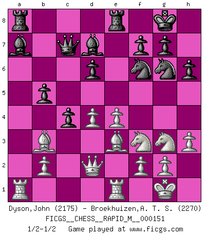 Last move : 1/2-1/2 2023 November 9 18:21:17 [Event "FICGS__CHESS__RAPID_M__000151"] [Site "FICGS"] [Date "2023.10.18"] [Round "1"] [White "Dyson,John"] [Black "Broekhuizen,A. T. S."] [Result "1/2-1/2"] [WhiteElo "2175"] [BlackElo "2270"] 1.e4 e5 2.Nf3 Nc6 3.Bc4 Bc5 4.d3 Nf6 5.O-O a6 6.Re1 O-O 7.c3 Ba7 8.h3 d6 9.a4 b5 10.Ba2 h6 11.Nbd2 Ne7 12.Nf1 Ng6 13.Ng3 Bd7 14.Bb3 c5 15.d4 Qc7 16.Be3 Rfe8 17.axb5 axb5 18.Qd2 exd4 19.cxd4 c4 1/2-1/2 Follow this game move after move (download)Chess is 99 percent tactics. (Teichmann) Ich erzeugte keinen Neid, da mich die Schachspieler als Musiker und die Musiker als Schachspieler betrachteten. (Mark Taimanov) La batalla por la última verdad nunca sera ganada. Y es por eso que el Ajedrez es tan fascinante. (Hans Kmoch) La vie est comme un jeu d'échecs : nous esquissons un plan, mais celui-ci est tributaire de ce que daignent faire l'adversaire aux échecs et le destin dans la vie. (Arthur Schopenhauer) No enterprise is more likely to succeed than one concealed from the enemy until it is ripe for execution. (Niccolo Machiavelli)