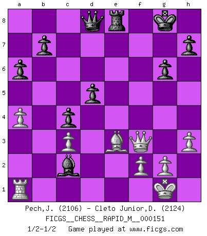 Last move : 1/2-1/2 2024 January 20 2:4:49 [Event "FICGS__CHESS__RAPID_M__000151"] [Site "FICGS"] [Date "2023.10.18"] [Round "1"] [White "Pech,Jaroslav"] [Black "Cleto Junior,Dirceu"] [Result "1/2-1/2"] [WhiteElo "2106"] [BlackElo "2124"] 1.e4 e6 2.d4 d5 3.Nc3 Bb4 4.e5 c5 5.a3 Bxc3+ 6.bxc3 Ne7 7.Qg4 O-O 8.Bd3 f5 9.exf6 Rxf6 10.Bg5 Rf7 11.Qh5 g6 12.Qd1 Nbc6 13.Nf3 Qa5 14.Bd2 c4 15.Be2 Nf5 16.O-O Bd7 17.Ng5 Re7 18.Bg4 e5 19.Bxf5 Bxf5 20.dxe5 Nxe5 21.h3 Rae8 22.Re1 a6 23.Nf3 Nxf3+ 24.Qxf3 Bxc2 25.Rxe7 Rxe7 26.Be3 Re8 27.a4 Qd8 1/2-1/2 Follow this game move after move (download)Not all artists are Chess players, but all Chess players are artists. (Marcel Duchamp) Sicherlich können nur Meister einen Stil haben. Daß ein nicht-Meister auch nur ein einziges Mal in seinem Leben eine Partie folgerecht durchführte, habe ich niemals bemerkt. (Emanuel Lasker) Repentinamente, me resultaba obvio en mi analisis que yo había pasado por alto lo que Fischer había visto en el tablero con la mas grande facilidad. (Mikhail Botvinnik) On est toujours la mazette de quelqu'un d'autre. (Anonyme) Is not life a hundred times too short to bore ourselves ? (Friedrich Nietzsche)