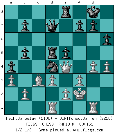 Last move : 1/2-1/2 2024 January 20 1:59:50 [Event "FICGS__CHESS__RAPID_M__000151"] [Site "FICGS"] [Date "2023.10.18"] [Round "1"] [White "Pech,Jaroslav"] [Black "DiAlfonso,Darren"] [Result "1/2-1/2"] [WhiteElo "2106"] [BlackElo "2228"] 1.c4 Nf6 2.Nc3 e5 3.Nf3 Nc6 4.g3 d5 5.cxd5 Nxd5 6.Bg2 Bc5 7.O-O O-O 8.d3 h6 9.Nxd5 Qxd5 10.a3 a5 11.Bd2 Rd8 12.Bc3 Qe6 13.Qc2 Qe7 14.Rac1 Bb6 15.Nd2 Be6 16.Nc4 Bd5 17.Nxb6 cxb6 18.Rfe1 Bxg2 19.Kxg2 Rd5 20.Qa4 Qd7 21.Qe4 a4 22.h3 b5 23.f3 Re8 24.g4 Nd8 25.h4 Ne6 26.Kf2 Nc5 27.Qe3 Nb3 28.Rcd1 Nd4 29.Qe4 Re6 30.Rg1 Re8 1/2-1/2 Follow this game move after move (download)I played Chess with him and would have beaten him sometimes only he always took back his last move, and ran the game out differently. (Mark Twain) Wenn ich gewinne bin ich ein Genie. Wenn nicht, dann bin ich keines. (Robert James Fischer) ¿Se han dado cuenta de que Fischer casi nunca ha tenido piezas malas? El las intercambia y las piezas malas se quedan con sus oponenets. (Yuri Balashov) Le thème de l'attaque double intervient d'une manière ou d'une autre dans l'immense majorité des combinaisons. (Youri Averbakh) The absolute truth is the thing that makes people laugh. (Carl Reiner)