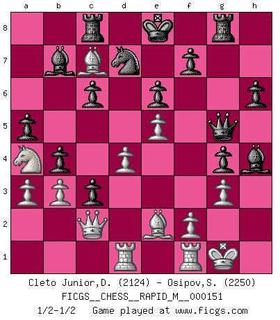 Last move : 1/2-1/2 2023 October 22 9:41:13 [Event "FICGS__CHESS__RAPID_M__000151"] [Site "FICGS"] [Date "2023.10.18"] [Round "1"] [White "Cleto Junior,Dirceu"] [Black "Osipov,Sergey"] [Result "1/2-1/2"] [WhiteElo "2124"] [BlackElo "2250"] 1.d4 Nf6 2.c4 e6 3.Nf3 d5 4.Nc3 c6 5.Bg5 h6 6.Bh4 dxc4 7.e4 g5 8.Bg3 b5 9.Be2 Bb7 10.h4 g4 11.Ne5 Nbd7 12.Nxd7 Qxd7 13.Be5 Qe7 14.b3 Rg8 15.Qc2 Nd7 16.Bg3 b4 17.Na4 Bg7 18.Rd1 c3 19.a3 a5 20.O-O Bf6 21.Bc7 Bxh4 22.e5 Qg5 23.g3 Rc8 1/2-1/2 Follow this game move after move (download)It was clear to me that the vulnerable point of the American Grandmaster (Bobby Fischer) was in double-edged, hanging, irrational positions, where he often failed to find a win even in a won position. (Efim Geller) Es ist wirklich schade, dass so viele Schachspieler nicht auf ihr Äußeres achten! (Alexandra Kosteniuk) ¿Quién es tu oponente esta tarde? Esta tarde mi oponente son las piezas negras. (Akiba Rubinstein) Aux échecs, les retours au sommet sont rares : les dommages psychologiques consécutifs à une défaite sont trop sévères. (Daily Telegraph) Memory is a complicated thing, a relative to truth, but not its twin. (Barbara Kingsolver, Animal Dreams)