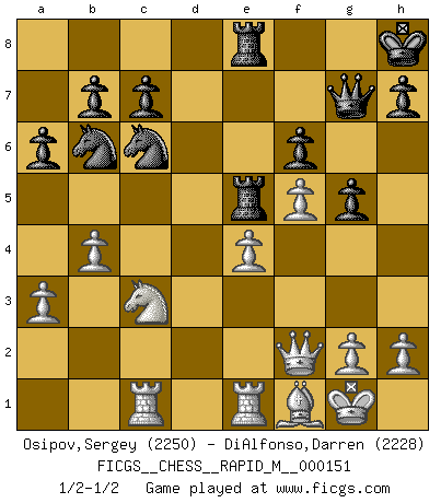Last move : 1/2-1/2 2023 November 26 14:28:4 [Event "FICGS__CHESS__RAPID_M__000151"] [Site "FICGS"] [Date "2023.10.18"] [Round "1"] [White "Osipov,Sergey"] [Black "DiAlfonso,Darren"] [Result "1/2-1/2"] [WhiteElo "2250"] [BlackElo "2228"] 1.d4 Nf6 2.c4 e5 3.dxe5 Ng4 4.e4 Nxe5 5.f4 Nec6 6.a3 d6 7.Nf3 g6 8.Bd2 Bh6 9.Be2 Bg4 10.Nc3 Nd7 11.Nd5 Bg7 12.Bc3 Bxf3 13.Bxf3 Bxc3+ 14.Nxc3 O-O 15.O-O Nb6 16.Be2 Qf6 17.Qe1 Rae8 18.Rd1 Nd4 19.Bd3 Qg7 20.Qf2 Ne6 21.Be2 Kh8 22.Rfe1 f6 23.Bf1 g5 24.f5 Nd8 25.c5 dxc5 26.Qxc5 Re5 27.Qf2 a6 28.Rc1 Re7 29.b4 Nc6 30.Rb1 Re5 31.Rbd1 Rfe8 32.Rc1 1/2-1/2 Follow this game move after move (download)Chess is thirty to forty percent psychology. You don't have this when you play a computer. I can't confuse it. (Judith Polgar) Der Verteidiger gebe der Gewalt nach, aber nur der Gewalt. Er schaffe sich nicht freiwillig, etwa aus Blindheit oder aus Schrecken, irgendwelche Schwächen. Er lasse sich nicht bluffen. (Emanuel Lasker) Fischer era un maestro de claridad y un Rey del posicionamiento astuto. Sus oponentes podían ver hacia donde se dirigía pero eran impotentes para detenerlo. (Bruce Pandolfini) Le pion, dans sa simplicité, marche droit devant lui, mais lorsqu'il prend, il le fait obliquement? Ainsi l'homme, tant qu'il reste pauvre, marche dans la droiture et vit honnêtement, mais lorsqu'il recherche les honneurs, il flatte, se parjure et, par les voies obliques, cherche une position supérieure sur l'échiquier du monde. (Jean de Galles) Art is the triumph over chaos. (John Cheever)