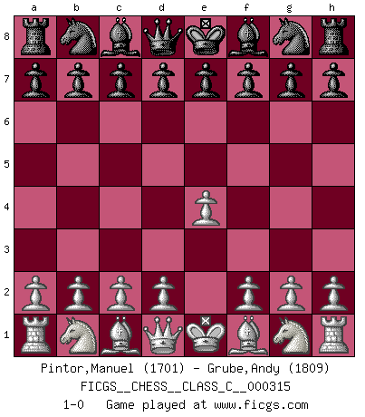 Last move : 1-0 2023 November 28 16:38:55 [Event "FICGS__CHESS__CLASS_C__000315"] [Site "FICGS"] [Date "2023.10.19"] [Round "1"] [White "Pintor,Manuel"] [Black "Grube,Andy"] [Result "1-0"] [WhiteElo "1701"] [BlackElo "1809"] 1.e4 1-0 This chess game has been lost on time (started : 2023.10.19 1:14:58) Follow this game move after move (download)Who is your opponent tonight, tonight I am playing against the Black pieces. (Akiba Rubinstein) Zum Sieg gelangt man nicht, wenn man gut, sondern nur wenn man besser spielt (Savielly Grigorievitsch Tartakower) Un jugador que trata de regresar una movida en el Ajedrez es un futuro carterista. (Richard Fenton) Les échecs sont plus proches de l'art de l'assassinat que de l'art de la guerre. (Arturo Perez-Reverte) Now the reason the enlightened prince and the wise general conquer the enemy whenever they move and their achievements surpass those of ordinary men is foreknowledge. (Sun Tzu)