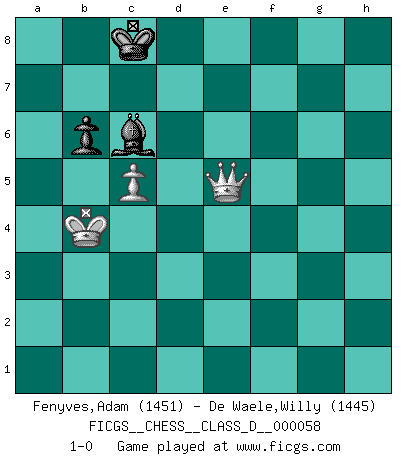 Last move : 1-0 2007 October 10 19:39:47 [Event "FICGS__CHESS__CLASS_D__000058"] [Site "FICGS"] [Date "2007.09.10"] [Round "1"] [White "Fenyves,Adam"] [Black "De Waele,Willy"] [Result "1-0"] [WhiteElo "1451"] [BlackElo "1445"] 1.e4 c5 2.Nf3 d6 3.d4 cxd4 4.Nxd4 Nf6 5.Nc3 a6 6.Bg5 e6 7.f4 Qb6 8.Nb3 Be7 9.Qf3 Nbd7 10.O-O-O Qc7 11.a4 h6 12.Bh4 g5 13.Bf2 gxf4 14.Qxf4 Rg8 15.Kb1 b6 16.Qxh6 Ng4 17.Qf4 Nxf2 18.Qxf2 Bf6 19.Nd4 Be5 20.h4 Bb7 21.h5 Nf6 22.h6 O-O-O 23.Rd3 Bxe4 24.Ncb5 axb5 25.Rc3 Qxc3 26.bxc3 bxa4 27.h7 Rh8 28.Nf3 Rxh7 29.Rxh7 Nxh7 30.Nxe5 dxe5 31.Qxf7 Nf8 32.Ba6+ Kb8 33.Qe7 Rd1+ 34.Kb2 Rd2 35.Qxf8+ Ka7 36.Qc8 Rxc2+ 37.Ka3 Bxg2 38.Qd7+ Kb8 39.Qxe6 Ka7 40.Qd7+ Kxa6 41.Qxa4+ Kb7 42.Qxc2 Bd5 43.Qf5 Bc6 44.Qxe5 Bd7 45.c4 Kc8 46.Kb4 Bc6 47.c5 1-0 Sicilian : Najdorf, 7...Qb6 Queenside Castling by player White (move 10) Queenside Castling by player Black (move 22) 10 pieces endgame at move 39 : White KQBP , Black KRBPPP WHITE : King + 1 Queen 1 Bishop 1 Pawn BLACK : King + 1 Rook 1 Bishop 3 Pawns 9 pieces endgame at move 40 : White KQP , Black KRBPPP WHITE : King + 1 Queen 1 Pawn BLACK : King + 1 Rook 1 Bishop 3 Pawns 8 pieces endgame at move 41 : White KQP , Black KRBPP WHITE : King + 1 Queen 1 Pawn BLACK : King + 1 Rook 1 Bishop 2 Pawns 7 pieces endgame at move 42 : White KQP , Black KBPP WHITE : King + 1 Queen 1 Pawn BLACK : King + 1 Bishop 2 Pawns 6 pieces endgame at move 44 : White KQP , Black KBP WHITE : King + 1 Queen 1 Pawn BLACK : King + 1 Bishop 1 Pawn Player White won this chess game. Follow this game move after move (download)Fischer Chess play was always razor-sharp, rational and brilliant. One of the best ever. (Dave Regis) Ich verachte die Medien. (Robert James Fischer) Existen dos clases de sacrificios: los correctos y los míos. (Mikhail Tal) Les échecs sont utiles à l'exercice de la faculté de penser et à celle de l'imagination. Car nous devons posséder une méthode élaborée pour atteindre des buts partout où nous devons conduire notre raison. (Leibnitz) Industry executives and analysts often mistakenly talk about strategy as if it were some kind of chess match. But in chess, you have just two opponents, each with identical resources, and with luck playing a minimal role. The real world is much more like a poker game, with multiple players trying to make the best of whatever hand fortune has dealt them. In our industry, Bill Gates owns the table until someone proves otherwise. (David Moschella, 'Computerworld')