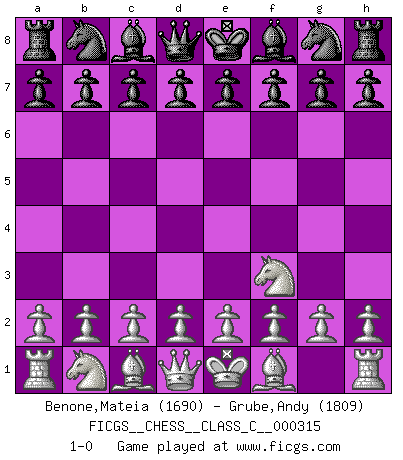 Last move : 1-0 2023 December 8 22:50:41 [Event "FICGS__CHESS__CLASS_C__000315"] [Site "FICGS"] [Date "2023.10.19"] [Round "1"] [White "Benone,Mateia"] [Black "Grube,Andy"] [Result "1-0"] [WhiteElo "1690"] [BlackElo "1809"] 1.Nf3 1-0 This chess game has been lost on time (started : 2023.10.19 1:14:58) Follow this game move after move (download)The King is a fighting piece. Use it ! (Wilhelm Steinitz) Kombinieren und Schwarzhandel gehören verboten. (Savielly Grigorievitsch Tartakower) Cada Peón es potencialmente una Reina. (James Mason) La tactique est l'élément le plus important du milieu de jeu. (Siegbert Tarrasch) In every real man a child is hidden that wants to play. (Friedrich Nietzsche)