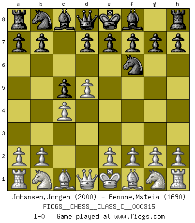 Last move : 1-0 2023 December 14 16:50:1 [Event "FICGS__CHESS__CLASS_C__000315"] [Site "FICGS"] [Date "2023.10.19"] [Round "1"] [White "Johansen,Jorgen"] [Black "Benone,Mateia"] [Result "1-0"] [WhiteElo "2000"] [BlackElo "1690"] 1.d4 Nf6 2.c4 c5 3.d5 1-0 This chess game has been lost on time (started : 2023.10.19 1:14:58) Follow this game move after move (download)I'm not a materialistic person, in that, I don't suffer the lack or loss of money. The absence of worldly goods I don't look back on. For Chess is a way I can be as materialistic as I want without having to sell my soul. (Jamie Walter Adams) Wie ich sie so einen nach dem anderen nieder mähte wurde meine Überlegenheit offensichtlich. (José Raúl Capablanca) Algunos sacrificios son sólidos, los demás son míos. (Mikhail Tal) Les échecs c'est le défi de l'alpiniste, toujours plus haut, prêt à tout pour monter à l'assaut du Roi ennemi. Les échecs, c'est de la musique en mouvement, un ballet majestueux pour les yeux. C'est de la poésie composée par les fantômes du passé qui au même titre que Rimbaud ou Verlaine méritent notre admiration. Les échecs, c'est de la peinture ou le moindre mouvement modifie le tableau pour en faire un Picasso ou un Van Gogh. Les échecs, c'est tout et rien, c'est la vie et la mort. Jjulie33 sur le forum de France-Echecs. Political correctness is subjecting us to gross incompetence. (Johann Piek)