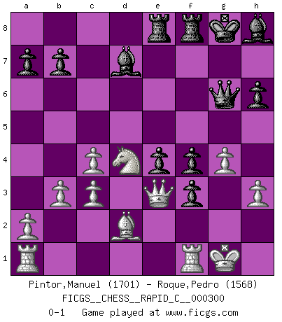 Last move : 0-1 2023 November 3 13:12:44 [Event "FICGS__CHESS__RAPID_C__000300"] [Site "FICGS"] [Date "2023.10.19"] [Round "1"] [White "Pintor,Manuel"] [Black "Roque,Pedro"] [Result "0-1"] [WhiteElo "1701"] [BlackElo "1568"] 1.e4 c5 2.f4 g6 3.Nf3 d6 4.Bc4 Nc6 5.O-O Bg7 6.c3 Nf6 7.Ng5 O-O 8.d3 d5 9.exd5 Nxd5 10.Qf3 e6 11.Qh3 h6 12.Ne4 Na5 13.Nbd2 Nxf4 14.Qf3 e5 15.Nxc5 g5 16.Nde4 Nxc4 17.dxc4 f5 18.Ng3 Qe7 19.Nb3 e4 20.Qe3 Nd3 21.Nh5 f4 22.Qe2 Bh8 23.Nd4 Bd7 24.h3 Rae8 25.b3 Qd6 26.Bd2 Qg6 27.g4 f3 28.Qe3 Nf4 29.Nxf4 gxf4 0-1 Follow this game move after move (download)When you don't know what to do, wait for your opponent to get an idea - it's sure to be wrong. (Tarrasch) Rauchen ist dem Schachspieler bei seiner Arbeit, also im Wettkampf, untersagt. (Viktor Kortschnoi) El Ajedrez lo es todo: arte, ciencia y deporte. (Anatoly Karpov) Si rien de grave n'est détecté lors de l'analyse d'une position, on joue alors le coup. Seconde règle de Blumenfeld. There are two kinds of tragedy in this world, one is not getting what you want and the other is getting. (Lord of war)