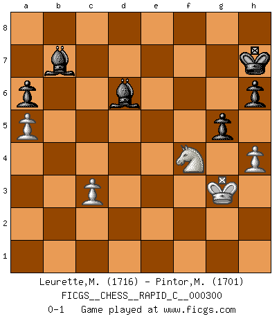 Last move : 0-1 2023 November 2 8:15:57 [Event "FICGS__CHESS__RAPID_C__000300"] [Site "FICGS"] [Date "2023.10.19"] [Round "1"] [White "Leurette,Marc-Antoine"] [Black "Pintor,Manuel"] [Result "0-1"] [WhiteElo "1716"] [BlackElo "1701"] 1.e4 e5 2.Nf3 Nc6 3.Bc4 Qf6 4.O-O d6 5.d3 h6 6.Nc3 Nge7 7.Be3 Bg4 8.h3 Bh5 9.Nd5 Nxd5 10.Bxd5 Be7 11.c3 O-O 12.g4 Qg6 13.Nh2 Kh8 14.f4 f5 15.exf5 Rxf5 16.Be4 Raf8 17.Bxf5 Rxf5 18.fxe5 Rxf1+ 19.Nxf1 Nxe5 20.Qe2 Nxg4 21.Qg2 Nxe3 22.Qxg6 Bxg6 23.Nxe3 Bxd3 24.Nd5 Bd8 25.Re1 Bg6 26.Nf4 Bf7 27.a4 c6 28.Kg2 Kh7 29.b4 a6 30.a5 c5 31.Rd1 Be7 32.bxc5 Bb3 33.Rb1 Bc2 34.Rxb7 Be4+ 35.Kg3 Bxb7 36.cxd6 Bxd6 37.h4 g5 0-1 Follow this game move after move (download)The chessboard is the world, the pieces are the phenomena of the Universe, the rules of the game are what we call the laws of Nature and the player on the other side is hidden from us. (Thomas Huxley) Wenn Dein Gegner dir ein Remis anbietet, versuch herauszufinden, weshalb er glaubt schlechter zu stehen. (Nigel Short) Un mal dÃa en el Ajedrez, es mejor que cualquier buen dÃa en el trabajo. (Anonymous) On a dit que l'homme se distingue de l'animal par le fait qu'il achète plus de livres qu'il ne peut en lire. Je voudrais suggérer qu'inclure à la liste des livres quelques livres d'échecs rendrait la distinction manifeste. (Edward Lasker) Empty your mind, be formless, shapeless — like water. (Bruce Lee)