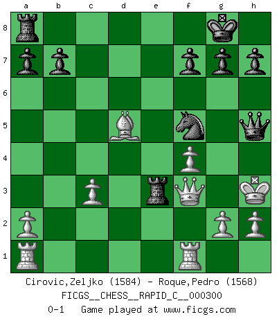 Last move : 0-1 2023 November 27 10:30:56 [Event "FICGS__CHESS__RAPID_C__000300"] [Site "FICGS"] [Date "2023.10.19"] [Round "1"] [White "Cirovic,Zeljko"] [Black "Roque,Pedro"] [Result "0-1"] [WhiteElo "1584"] [BlackElo "1568"] 1.e4 c5 2.f4 d5 3.exd5 Nf6 4.c4 e6 5.d4 cxd4 6.Qxd4 Nc6 7.Qd1 exd5 8.cxd5 Bb4+ 9.Nc3 Nxd5 10.Bd2 Bxc3 11.Bxc3 O-O 12.Nf3 Re8+ 13.Kf2 Bg4 14.Bc4 Bxf3 15.Qxf3 Qb6+ 16.Kg3 Nxc3 17.bxc3 Re3 18.Bd5 Ne7 19.Rhf1 Nf5+ 20.Kg4 Qg6+ 21.Kh3 Qh5+ 0-1 Follow this game move after move (download)It is peculiar but a fact nevertheless, that gamblers in chess always have enthusiastic followers. (Botvinnik) Offensichtlich kennt Kasparow nichts anderes als Schach, und ich könnte 500 weitere Spieler dieser Sorte benennen. (Judith Polgar) Bobby es la celebridad menos entendida y malinterpretada que camina el la faz de esta tierra. (Yasser Seirawan) Mon pion favori sur ma case favorite ! Bronstein en parlant d'un coup de pion en h5 quand il avait les Noirs. God, you are such an idiot. - Actually, I thought I was more of a jerk. (Gregory House to Stacy Warner, House M.D.)