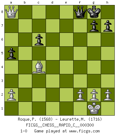 Last move : 1-0 2023 November 16 7:32:27 [Event "FICGS__CHESS__RAPID_C__000300"] [Site "FICGS"] [Date "2023.10.19"] [Round "1"] [White "Roque,Pedro"] [Black "Leurette,Marc-Antoine"] [Result "1-0"] [WhiteElo "1568"] [BlackElo "1716"] 1.e4 e5 2.Nf3 Nc6 3.Bb5 Nf6 4.O-O Nxe4 5.Re1 Nd6 6.Nxe5 Nxe5 7.Rxe5+ Be7 8.Bf1 O-O 9.d4 b6 10.Nc3 Bb7 11.Nd5 Bxd5 12.Rxd5 c6 13.Re5 Bf6 14.Re2 Re8 15.Bf4 Rxe2 16.Qxe2 Bxd4 17.Bxd6 Bxb2 18.Rd1 Bf6 19.Qf3 b5 20.c4 bxc4 21.Bxc4 Qa5 22.Qb3 Qh5 23.Bb8 Be5 24.Bxe5 Qxe5 25.Rxd7 Qe1+ 26.Bf1 Qe8 27.Qb7 a5 28.Rxf7 Qxf7 29.Qxa8+ Qf8 30.Bc4+ 1-0 Follow this game move after move (download)With or without the title, Bobby Fischer was unquestionably the greatest player of his time. (Burt Hochberg) In der Schule lernt man nichts. Es ist nur Zeitverschwendung. (Robert James Fischer) Vive, pierde y aprende al observar a tu oponente como ganar. (Amber Steenbock) L'attaque fait le spectacle, la défense gagne les matchs. (Dicton footballistique) It is not true that people stop pursuing dreams because they grow old, they grow old because they stop pursuing dreams. (Gabriel Garcia Marquez)