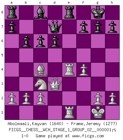 Last move : 1-0 2006 July 7 14:27:21 [Event "FICGS__CHESS__WCH_STAGE_1_GROUP_02__000001 "] [Site "FICGS"] [Date "2006.07.01"] [Round "1"] [White "Abolmaali,Kayvan"] [Black "Frame,Jeremy"] [Result "1-0"] [WhiteElo "1640"] [BlackElo "1277"] 1.e4 e5 2.f4 Bc5 3.Nf3 d6 4.d4 exd4 5.Nxd4 Nf6 6.Nc3 O-O 7.Bc4 Re8 8.Qd3 Nc6 9.Nxc6 bxc6 10.Be3 Bb6 11.O-O Qe7 12.Rae1 Nxe4 13.Bxb6 cxb6 14.Rxe4 Qd7 15.Rfe1 1-0 KGD : Classical variation Kingside Castling by player Black (move 6) Kingside Castling by player White (move 11) Player White won this chess game. Follow this game move after move (download)All my games are real. (Bobby Fischer) Schach ist eine Sache der genauen Beurteilung, wann man zuschlagen und wann man sich ducken muss. (Robert James Fischer) El Ajedrez, como la música, como el amor, tiene el poder de hacer feliz a la gente. (Siegbert Tarrasch) Karpov est une pièce de musée. (Garry Kasparov) Bobby never cared about money, though. His only desire was to prove that his choices were correct: He wanted chess to be important because he was a chess player, and he wanted to be important. Bobby knew money was important, but he didn't have a clue why, outside of clothes and status. The only way he could accomplish what he wanted was to fight for a lot of money. Once he got it, he gave it away. He did not know how to spend it. And once he'd become champion, after, essentially, sacrificing his life for it, he didn't know how to spend his time. (Bob Wade)