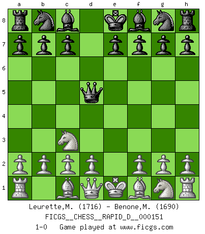 Last move : 1-0 2023 November 21 18:2:1 [Event "FICGS__CHESS__RAPID_D__000151"] [Site "FICGS"] [Date "2023.10.20"] [Round "1"] [White "Leurette,Marc-Antoine"] [Black "Benone,Mateia"] [Result "1-0"] [WhiteElo "1716"] [BlackElo "1690"] 1.e4 d5 2.exd5 Qxd5 3.Nc3 1-0 Follow this game move after move (download)What would Chess be without silly mistakes ? (Kurt Richter) Alle offensichtlichen Züge sehen nach dem Spiel in der Analyse verdächtig aus. (Viktor Kortschnoi) Un mal plan es mejor que no tener ningún plan. (Frank Marshall) Le joueur d'Echecs qui veut atteindre le top est obligé de développer son propre credo créatif. Alexeï Stepanovicth Souétine. Il est facile d'écrire des livres ! Ce qui est difficile, c'est de jouer ! (Alexeï Stepanovicth Souétine) A government big enough to give you everything you want is strong enough to take everything you have. (Thomas Jefferson)