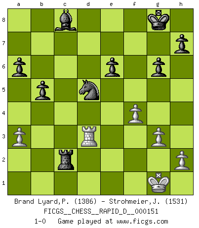 Last move : 1-0 2023 December 21 23:31:9 [Event "FICGS__CHESS__RAPID_D__000151"] [Site "FICGS"] [Date "2023.10.20"] [Round "1"] [White "Brand Lyard,Paul"] [Black "Strohmeier,Josef"] [Result "1-0"] [WhiteElo "1386"] [BlackElo "1531"] 1.e4 c5 2.Bc4 Nc6 3.Bxf7+ Kxf7 4.Qh5+ g6 5.Qxc5 e6 6.Qc4 Bg7 7.d3 Nge7 8.Bg5 Rf8 9.Bxe7 Qxe7 10.Nf3 Kg8 11.O-O a6 12.g3 Rxf3 13.Nd2 Rf7 14.c3 Ne5 15.Qc7 Nxd3 16.b4 d5 17.Qxe7 Rxe7 18.Rad1 Bxc3 19.Nb3 Nxb4 20.exd5 Nxd5 21.Rd3 b5 22.Nc5 Bb4 23.Rc1 Bxc5 24.Rxc5 Bb7 25.a3 Rc8 26.Rxc8+ Bxc8 27.f4 Rc7 28.Kf2 Rc2+ 29.Kg1 1-0 This chess game has been lost on time (started : 2023.10.20 1:12:14) Follow this game move after move (download)Chess is a fairy tale of 1001 blunders. (Savielly Tartakower) Wenn ich gewinne bin ich ein Genie. Wenn nicht, dann bin ich keines. (Robert James Fischer) En el Ajedrez, tal como es jugado por los Maestros, practicamente la suerte es eliminada. (Emanuel Lasker) Ne tendez aucun piège pour le plaisir ! Ne jouez rien dans l'espoir que l'adversaire réagisse de façon stupide ! Prenez toujours pour acquis que l'adversaire va trouver le meilleur coup ! Ne jouez jamais de coup dans l'espoir que l'adversaire ne voie pas la menace ! Chacun de vos coups doit améliorer la position d'une façon ou d'une autre. Somewhere in the world there is an epigram for every dilemma. (Hendrik Willem van Loon)