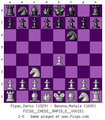 Last move : 1-0 2023 November 21 18:1:43 [Event "FICGS__CHESS__RAPID_D__000151"] [Site "FICGS"] [Date "2023.10.20"] [Round "1"] [White "Pipac,Darko"] [Black "Benone,Mateia"] [Result "1-0"] [WhiteElo "1329"] [BlackElo "1690"] 1.e4 Nf6 2.Nc3 1-0 Follow this game move after move (download)Chess is the gymnasium of the mind. (Blaise Pascal) Im Schach gibt es keinen Platz für Galanterie. (Irving Chernev) Una buena ofensiva y una buena defensa, comienzan ambas con un buen desarrollo. (Bruce A. Moon) Le système Elo représente seulement une moyenne. Il est simplement un indicateur de votre stabilité. (Anatoli Karpov) Creativity is allowing yourself to make mistakes. Art is knowing which ones to keep. (Scott Adams)