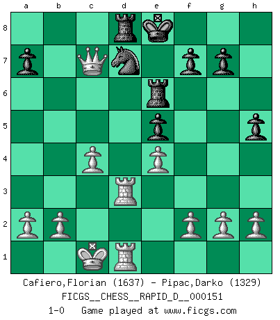Last move : 1-0 2023 November 15 21:31:2 [Event "FICGS__CHESS__RAPID_D__000151"] [Site "FICGS"] [Date "2023.10.20"] [Round "1"] [White "Cafiero,Florian"] [Black "Pipac,Darko"] [Result "1-0"] [WhiteElo "1637"] [BlackElo "1329"] 1.e4 e5 2.Nf3 d6 3.d4 Bg4 4.dxe5 Bxf3 5.Qxf3 dxe5 6.Bc4 Nf6 7.Qb3 Qd7 8.Qxb7 Qc6 9.Bb5 Qxb5 10.Qxb5+ Nbd7 11.Qc6 Rc8 12.Bg5 Be7 13.Bxf6 Bxf6 14.Nc3 Be7 15.O-O-O Rd8 16.Nd5 Bd6 17.Nxc7+ Bxc7 18.Qxc7 h5 19.c4 Rh6 20.Rd3 Re6 21.Rhd1 1-0 Follow this game move after move (download)In a gambit you give up a Pawn for the sake of getting a lost game. (Samuel Standige Boden) Es macht mich traurig, wenn ich sehe, dass Golfprofis mehr verdienen als Schachsportler. Obwohl ich davon überzeugt bin, dass wir Schachspieler viel härter trainieren müssen als die Golfer. (Alexandra Kosteniuk) El sobresalir en el Ajedrez es un signo de una mente intrigante. (Sir Arthur Conan Doyle) Ce qui est bien, c'est d'avoir tout un tas de pièces en prise : l'adversaire ne peut en prendre qu'une à la fois. Cité par Thierry Audin. Don't anthropomorphize computers - they hate it. (Anonymous)