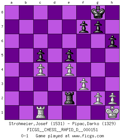 Last move : 0-1 2024 January 3 9:22:52 [Event "FICGS__CHESS__RAPID_D__000151"] [Site "FICGS"] [Date "2023.10.20"] [Round "1"] [White "Strohmeier,Josef"] [Black "Pipac,Darko"] [Result "0-1"] [WhiteElo "1531"] [BlackElo "1329"] 1.e4 e5 2.Nf3 d6 3.d4 Bg4 4.dxe5 Bxf3 5.Qxf3 dxe5 6.Bc4 Qd7 7.Qb3 b6 8.O-O Nc6 9.c3 Nf6 10.Rd1 Qe7 11.Bg5 h6 12.Bxf6 Qxf6 13.Bd5 Rd8 14.Na3 Bxa3 15.Qxa3 a5 16.Qa4 Rd6 17.b4 O-O 18.Rac1 Ne7 19.bxa5 bxa5 20.Qxa5 Rb8 21.Qc5 Rb2 22.f3 Nxd5 23.Rxd5 Rxd5 24.Qxd5 Qd6 25.Qc4 Qd2 26.Qf1 Rxa2 27.c4 Rc2 28.Rd1 Qe3+ 29.Kh1 Qe2 30.Qxe2 Rxe2 31.Rc1 c5 0-1 Follow this game move after move (download)Examine moves that smite! A good eye for smites is far more important than a knowledge of strategical principles. (Purdy) Ja, ich habe einmal eine Blitzpartie gespielt, es war in einem Zug, 1929. --im Interview 1989 (Mikhail Moiseyevich Botvinik) EL Ajedrez es como la vida. (Boris Spassky) J'ai toujours senti une vague pitié pour l'homme qui ne connaît rien aux échecs, tout comme j'en aurais pour un homme ignorant de l'amour. Les Echecs, comme la musique ou comme l'amour, ont le pouvoir de rendre heureux. (Siegbert Tarrasch) Cactus - It is depressed cucumber. (Ilmars Cirulis)