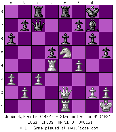 Last move : 0-1 2024 February 8 19:47:30 [Event "FICGS__CHESS__RAPID_D__000151"] [Site "FICGS"] [Date "2023.10.20"] [Round "1"] [White "Joubert,Hennie"] [Black "Strohmeier,Josef"] [Result "0-1"] [WhiteElo "1452"] [BlackElo "1531"] 1.e4 c5 2.Nf3 Nc6 3.d4 cxd4 4.Nxd4 Nf6 5.Nc3 e6 6.Bg5 Be7 7.Be2 a6 8.O-O O-O 9.Kh1 Qc7 10.f4 d6 11.Bf3 Bd7 12.Nxc6 Bxc6 13.a3 h6 14.Bh4 Rac8 15.Qd3 Rfe8 16.Rad1 Rcd8 17.Qe2 Nxe4 18.Nxe4 Bxh4 19.Nc3 Bf6 20.Bxc6 Qxc6 21.Rd3 d5 22.Nd1 Rc8 23.c3 g6 24.Nf2 Bg7 25.Ng4 h5 26.Ne5 Qc7 27.Re1 Qc4 28.Rd4 Qc7 0-1 This chess game has been lost on time (started : 2023.10.20 1:12:14) Follow this game move after move (download)In life, as in Chess, one's own Pawns block one's way. A man's very wealth, ease, leisure, children, books, which should help him to win, more often checkmate him. (Charles Buxton) Der Partner hat auch seine Existenzberechtigung. (Savielly Grigorievitsch Tartakower) El Ajedrez es un mar en el cual un mosquito puede beber y un elefante puede bañarse. (Refrán Hindú) Je menace de comprendre la position. (Anonyme) Perhaps chess is the wrong game for the times (The Chess Master and the Computer, by Garry Kasparov - 2010)